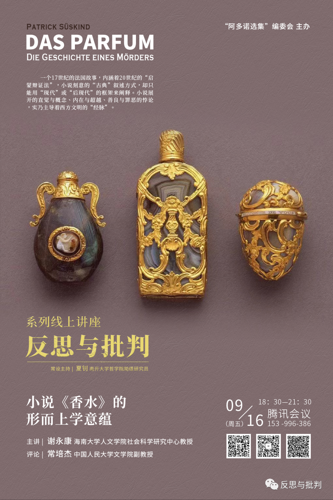 2022年9月16日晚,由“阿多诺选集”编委会主办的反思与批判系列讲座第一讲在线上如期举行。本次讲座由海南大学人文学院社会科学研究中心谢永康教授主讲,题目为“小说《香水》的形而上学意蕴”。讲座由南开大学哲学院助理研究员夏钊主持,中国人民大学文学院常培杰副教授担任评论人。