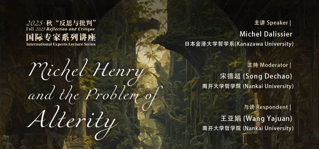 2025年9月17日晚,由南开大学哲学院、南开大学社会政治哲学研究中心、反思与批判平台主办的“反思与批判”国际专家系列讲座秋季学期第一讲,于南开大学哲学院317会议室举行。本次讲座由日本金泽大学人文科学与哲学系副教授Michel Dalissier主讲,讲座主题为“Michel Henry and the Problem of Alterity(米歇尔·亨利和他者性问题)”。讲座由南开大学哲学院副教授王亚娟担任与谈人,由南开大学哲学院助理研究员宋德超主持。讲座采用线上线下相结合的形式。