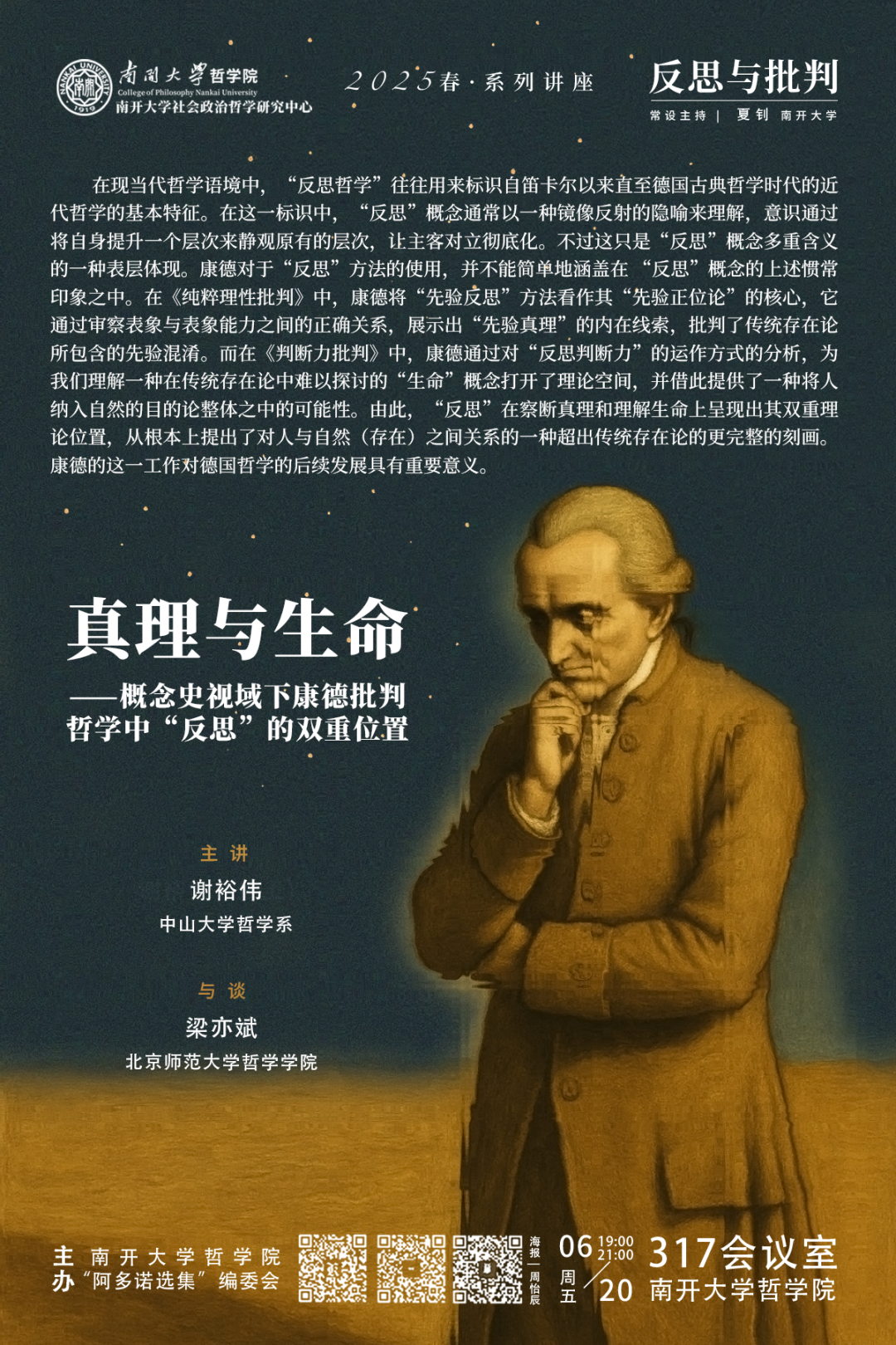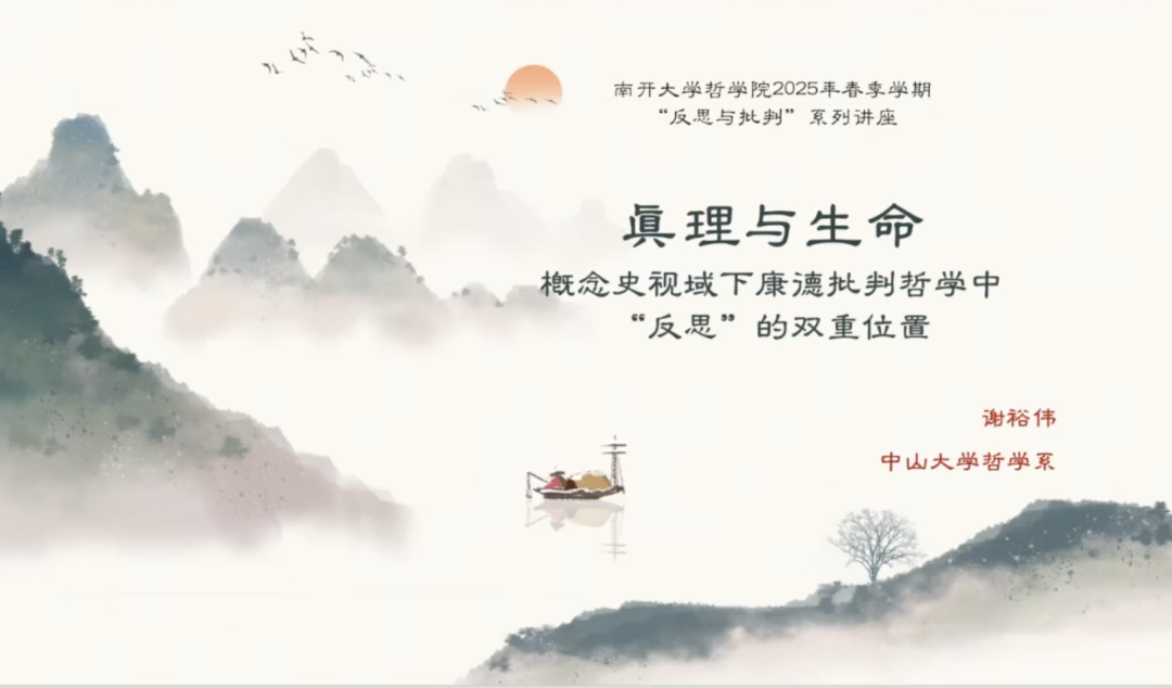 2025年6月20日晚,由南开大学哲学院、“阿多诺选集”编委会主办的“反思与批判”主系列讲座2025年春季学期第四讲在南开大学哲学院317会议室举行,讲座采用线上线下相结合的形式。本次讲座由中山大学哲学系谢裕伟副教授主讲,题目为“真理与生命——概念史视域下康德批判哲学中‘反思’的双重位置”。讲座由北京师范大学哲学学院外国哲学研究所梁亦斌副教授担任与谈人,由南开大学哲学院夏钊副教授主持。