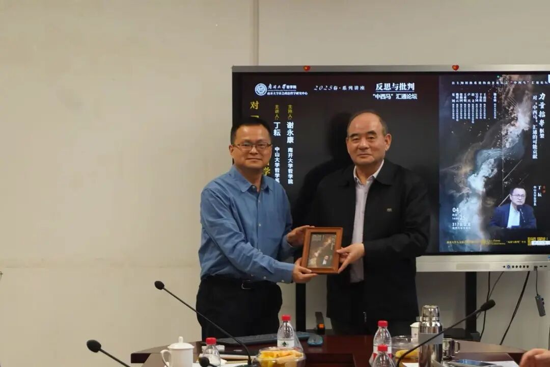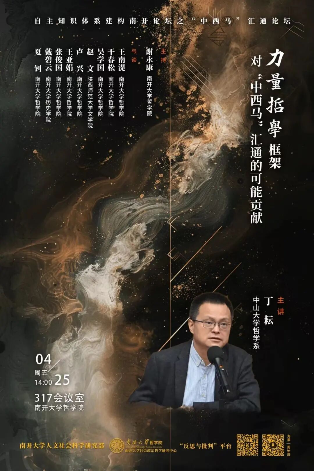 2025年4月25日下午,由南开大学人文社会科学研究部、南开大学哲学院、南开大学社会政治哲学研究中心和“反思与批判”平台共同主办的自主知识体系建构南开论坛之“中西马”汇通论坛第七讲在哲学院317会议室举办。本次讲座由中山大学哲学系丁耘教授主讲,主题为“力量哲学框架对‘中西马’汇通的可能贡献”。南开大学哲学院谢永康教授主持本次讲座,南开大学哲学院王南湜教授、南开大学哲学院院长干春松教授、陕西师范大学文学院赵文教授、南开大学哲学院卢兴教授、王亚娟副教授、张俊国副教授、夏钊副教授、南开大学历史学院戴碧云老师作为与谈人出席本次讲座。各位与谈人均提前做了充分准备,本次讲座就呈现为围绕丁耘教授发言的一场跨学科、全方位的深入研讨活动。