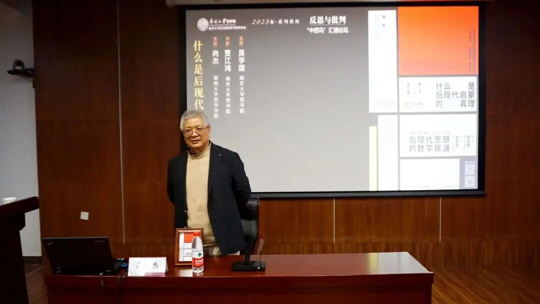 2025418日至19日,由南开大学人文社会科学研究部、南开大学哲学院、南开大学社会政治哲学研究中心主办的自主知识体系建构南开论坛之“中西马”汇通论坛第六讲在哲学院318会议室如期举行。本次两场讲座由郑州大学特聘教授、中国社会科学院哲学所研究员尚杰教授主讲,题目分别为“什么是后现代启蒙的真理”与“后现代思想的数学根源”。两场讲座分别由南开大学哲学院贾江鸿教授与南开大学哲学院贾向桐教授担任与谈人,由南开大学哲学院吴学国教授主持。