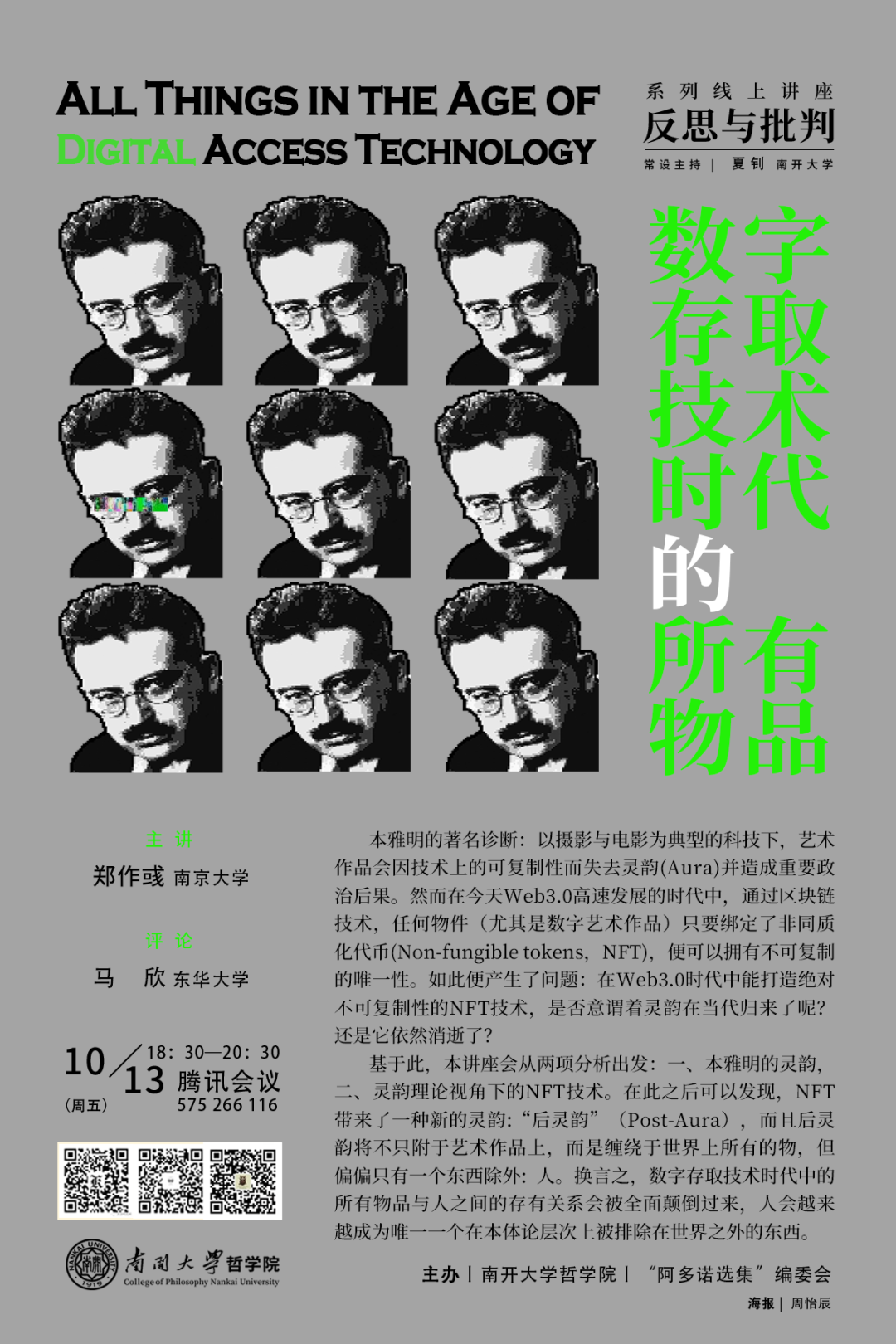 20231013日晚,由南开大学哲学院、“阿多诺选集”编委会主办的反思与批判系列讲座2023年秋季学期第二讲在线上如期举行。本次讲座由南京大学社会学院郑作彧教授主讲,题目为“数字存取技术时代的所有物品”。讲座由南开大学哲学院助理研究员夏钊主持,东华大学马克思主义学院副教授马欣担任评论人。