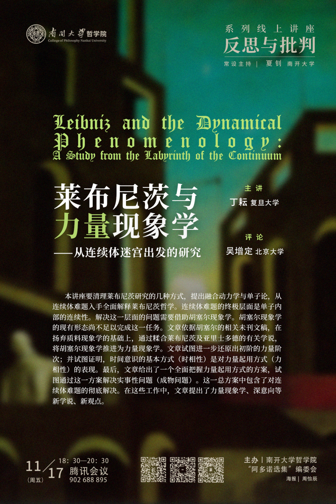 20231117日晚,由南开大学哲学院、“阿多诺选集”编委会主办的反思与批判系列讲座2023年秋季学期第三讲在线上如期举行。本次讲座由复旦大学哲学学院丁耘教授主讲,题目为“莱布尼茨与力量现象学——从连续体迷宫出发的研究”。讲座由北京大学哲学系吴增定教授担任评论人。
