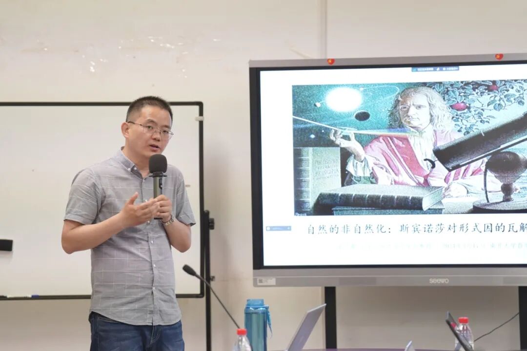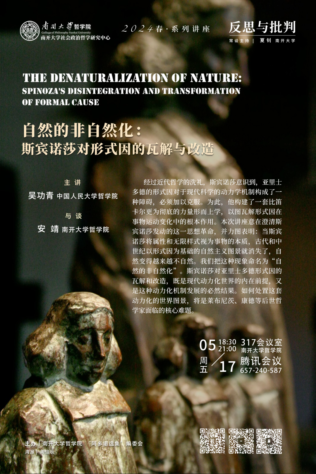 2024年5月17日晚,由南开大学哲学院、“阿多诺选集”编委会主办的“反思与批判”主系列讲座2024年春季学期第三讲在南开大学哲学院317会议室如期举行。本次讲座由中国人民大学哲学院吴功青教授主讲,题目为“自然的非自然化:斯宾诺莎对形式因的瓦解与改造”。讲座由南开大学哲学院安靖副教授担任与谈人,南开大学哲学院助理研究员夏钊主持,南开大学哲学院谢永康教授、王建军教授、邓向玲老师等也受邀出席了本次讲座。