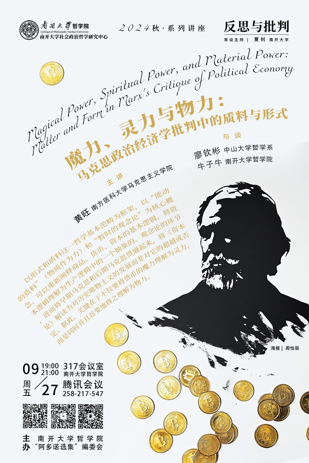 2024年9月27日晚,由南开大学哲学院、“阿多诺选集”编委会主办的“反思与批判”主系列讲座2024年秋季学期第一讲在南开大学哲学院317会议室如期举行。本次讲座由南方医科大学马克思主义学院教授黄旺老师主讲,题目为“魔力、灵力与物力:马克思政治经济学批判中的质料与形式”。讲座由中山大学哲学系教授廖钦彬以及南开大学哲学院讲师牛子牛担任与谈人,南开大学哲学院副教授夏钊主持,南开大学哲学院教授谢永康也受邀出席了本次讲座。