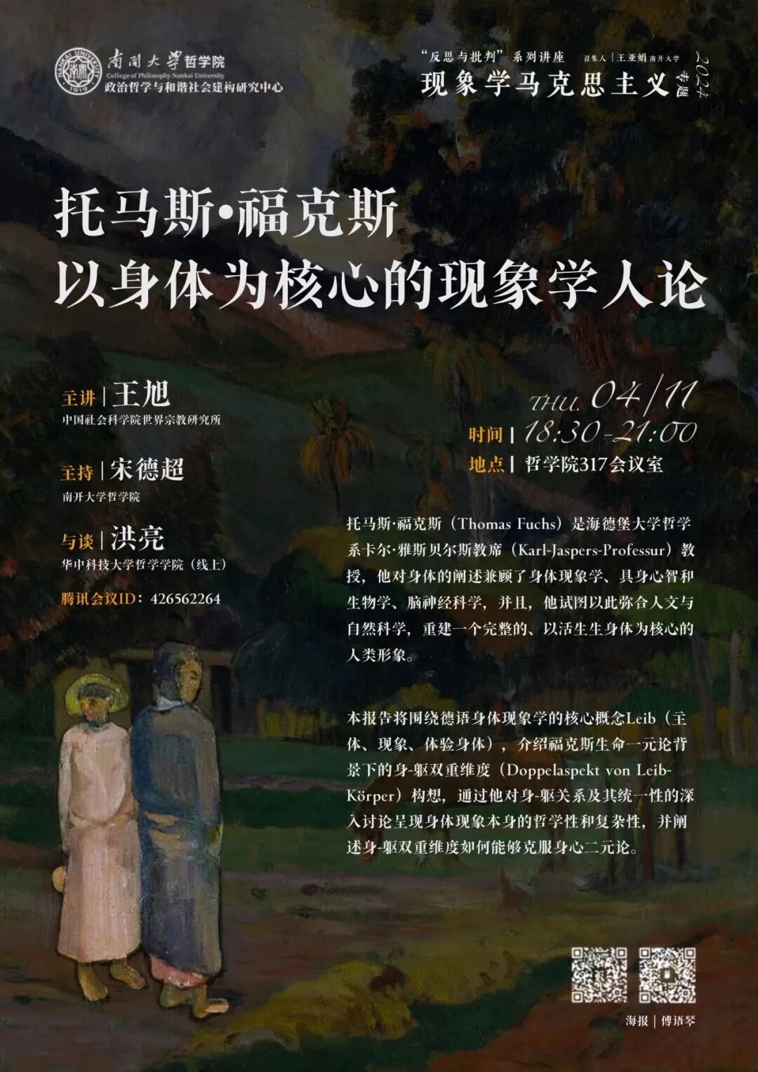2024年4月11日晚,由南开大学哲学院、社会政治哲学研究中心联合主办的“反思与批判·现象学马克思主义专题”2024年春季学期第三讲在南开大学哲学院317会议室如期举行。本次讲座题目为“托马斯·福克斯以身体为核心的现象学人论”,由中国社会科学院宗教研究所助理研究员王旭主讲,由华中科技大学哲学学院洪亮教授担任与谈人,南开大学哲学院助理研究员宋德超主持。讲座采用线上线下相结合的形式。