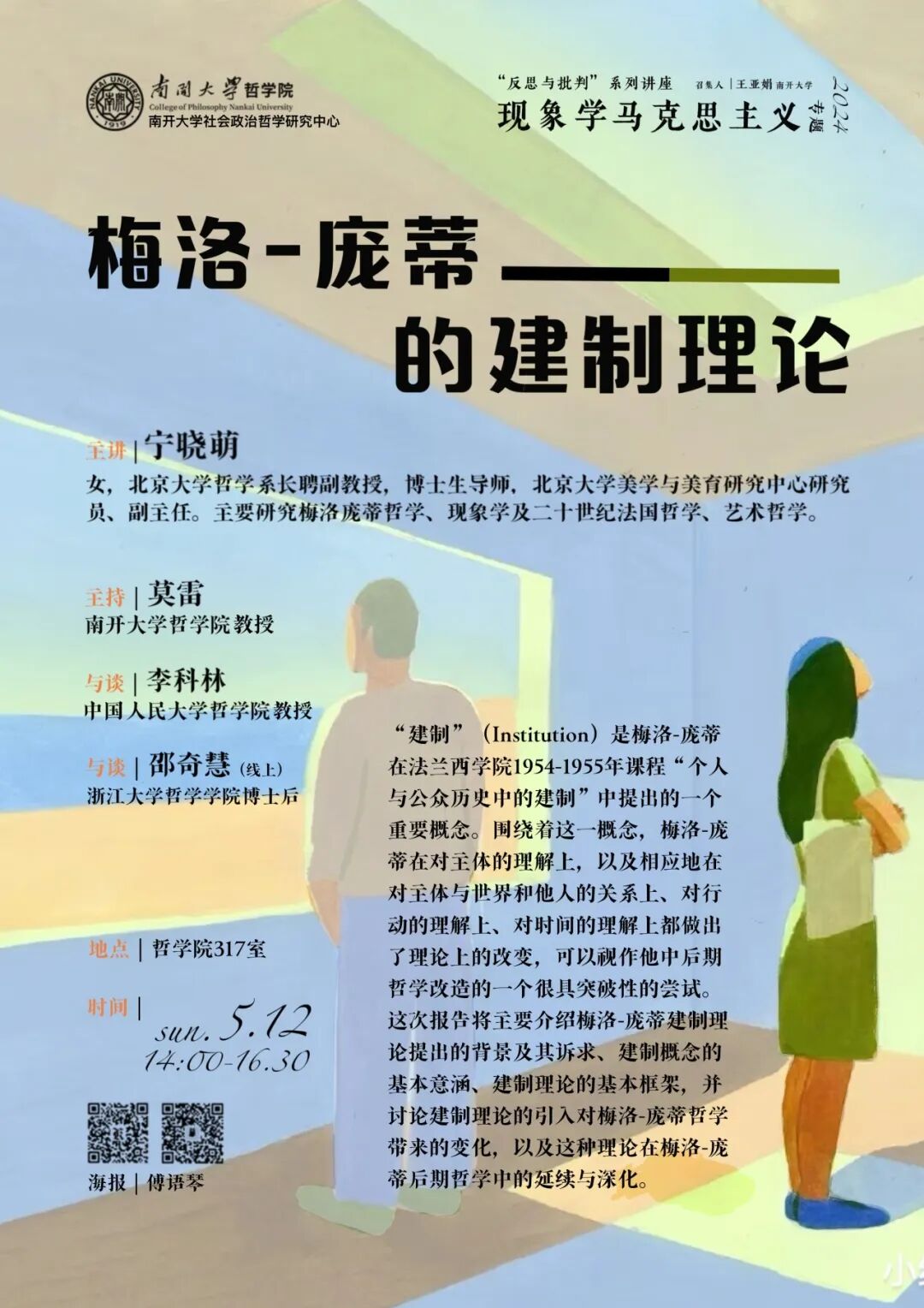2024年5月12日下午,由南开大学哲学院、社会政治哲学研究中心联合主办的“反思与批判·现象学马克思主义专题”系列讲座2024年春季学期第四期在南开大学哲学院317会议室如期举行。本期讲座题为“梅洛-庞蒂的建制理论”,由北京大学哲学系宁晓萌副教授主讲,中国人民大学哲学院李科林教授、浙江大学哲学学院博士后邵奇慧担任与谈人,南开大学哲学院莫雷教授主持。讲座采用线上线下相结合的形式进行,哲学院共计40余位师生参与活动。