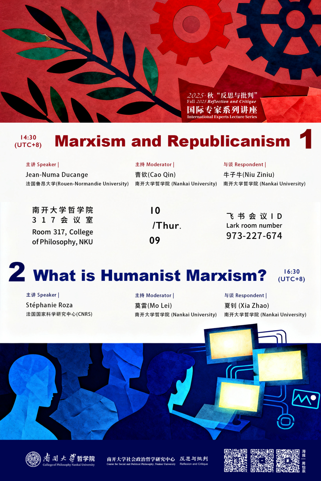 2025年10月9日下午,由南开大学哲学院、南开大学社会政治哲学研究中心及反思与批判平台联合主办的“反思与批判”国际专家系列讲座第二讲与第三讲,在南开大学哲学院317会议室顺利举行。两场讲座分别聚焦“马克思主义与共和主义”及“什么是人道主义马克思主义?”两大主题,采用线上线下相结合的方式同步开展,吸引了校内外众多师生参与。