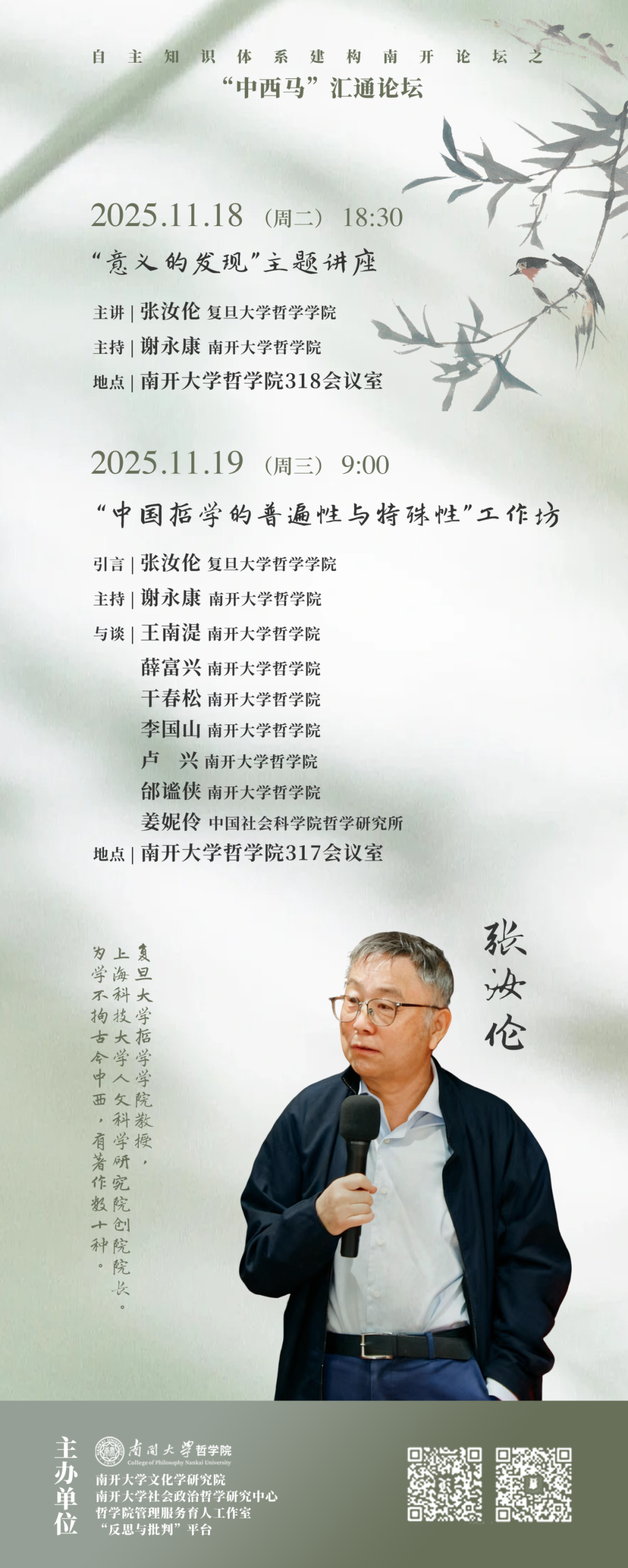 2025年11月18-19日,由南开大学哲学院、南开大学文化学研究院、南开大学社会政治哲学研究中心、哲学院管理服务育人工作室、“反思与批判”平台主办的自主知识体系建构南开论坛之“中西马”汇通论坛第八讲暨“中国哲学的普遍性与特殊性”工作坊在南开大学哲学院如期举行,活动分为主题讲座和工作坊两部分,并特邀复旦大学哲学学院张汝伦教授作为主讲人和引言人。