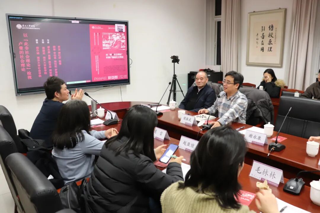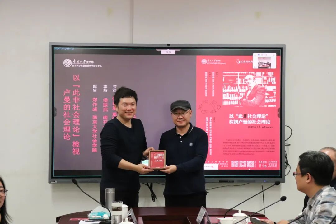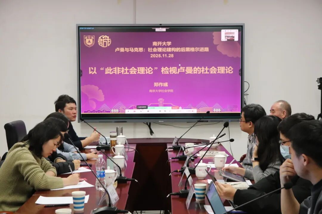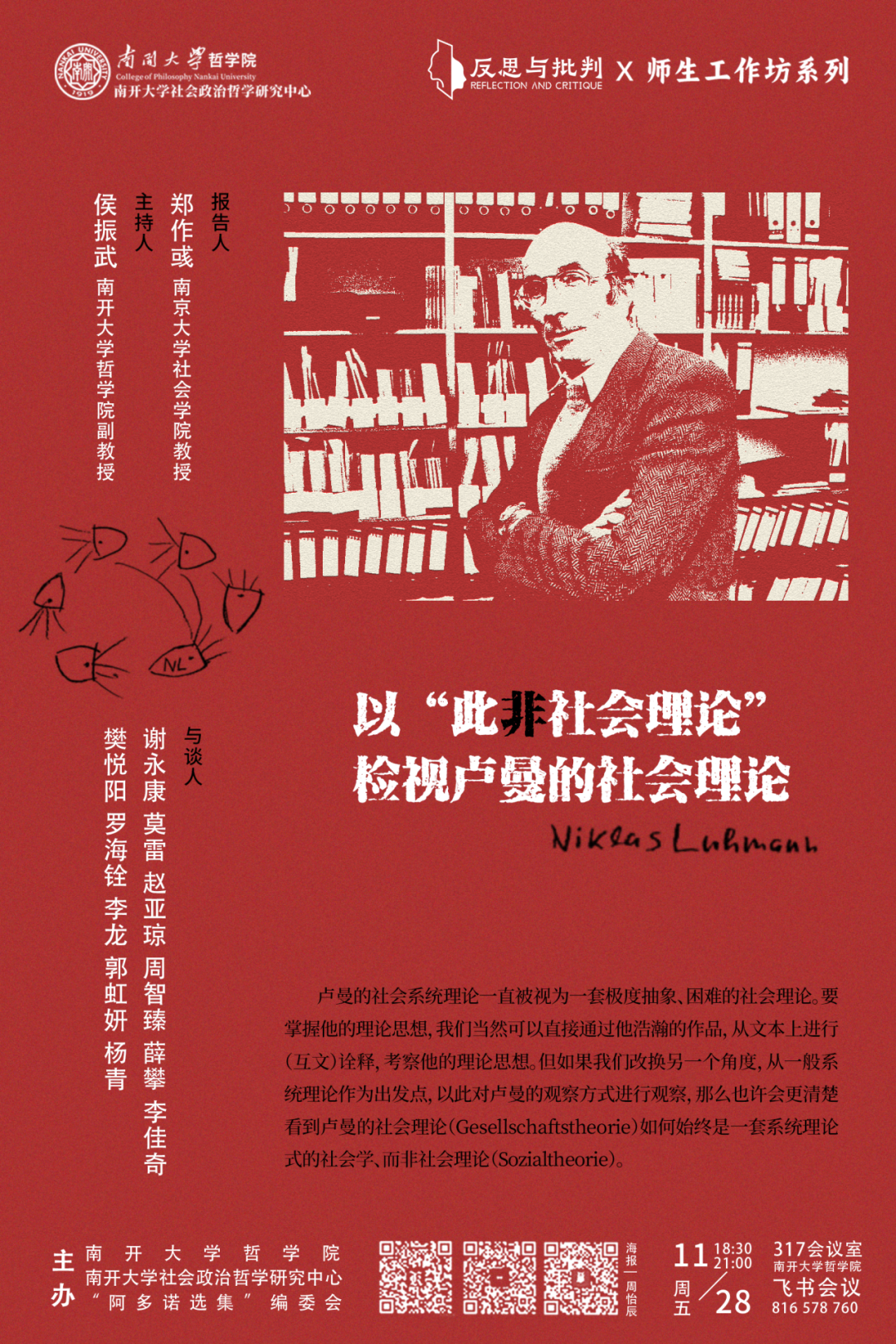 2025年11月28日晚,由南开大学哲学院、南开大学社会政治哲学研究中心、“阿多诺选集”编委会主办的反思与批判师生工作坊,在南开大学哲学院317会议室成功举行。本次工作坊的主题报告为“以‘此非社会理论’检视卢曼的社会理论”。工作坊邀请南京大学社会学院郑作彧教授担任报告人,由南开大学哲学院侯振武副教授主持,南开大学哲学院谢永康教授、莫雷教授、赵亚琼副教授、周智臻老师和多位哲学院博士生担任与谈人。南开大学哲学院王南湜教授、山东大学哲学与社会发展学院毛林林副教授、上海大学马克思主义学院肖宛直老师、山西大学马克思主义哲学研究所陈源老师等学者出席了本次活动。