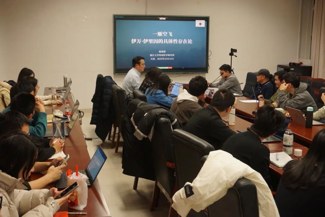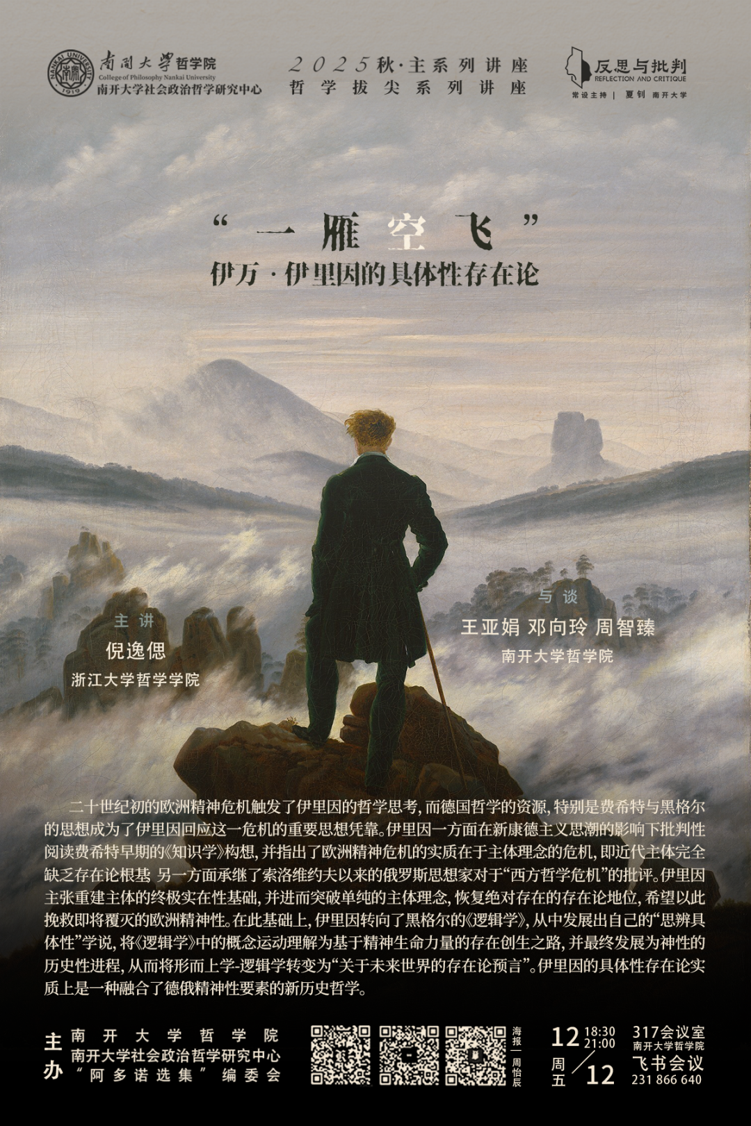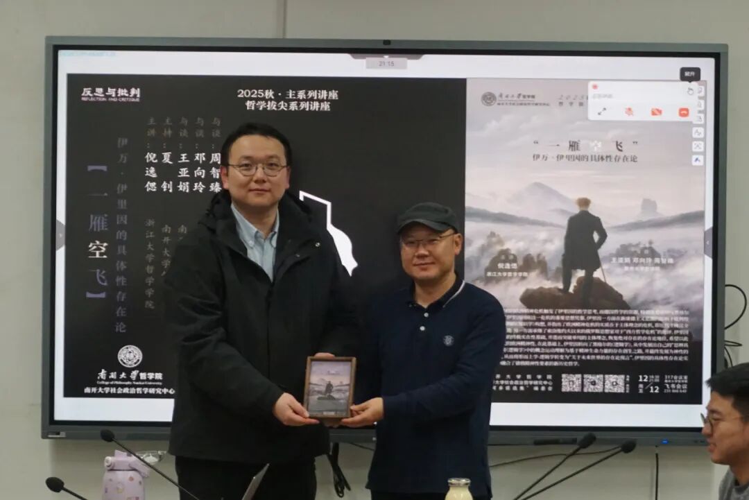 2025年12月12日晚,由南开大学哲学院、南开大学社会政治哲学研究中心、“阿多诺选集”编委会主办的“反思与批判”主系列讲座2025年秋季学期第四讲暨哲学拔尖系列讲座在南开大学哲学院317会议室举行,讲座采用线上线下相结合的形式。本次讲座由浙江大学外国哲学研究所百人计划研究员、博士生导师倪逸偲主讲,题目为“‘一雁空飞’:伊万·伊里因的具体性存在论”。讲座由南开大学哲学院王亚娟副教授、邓向玲老师、周智臻老师担任与谈人,由南开大学哲学院夏钊副教授主持。南开大学哲学院谢永康教授、王天老师、祁箫老师、肖京老师等出席本次讲座。
