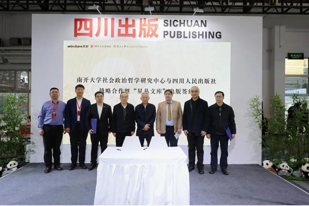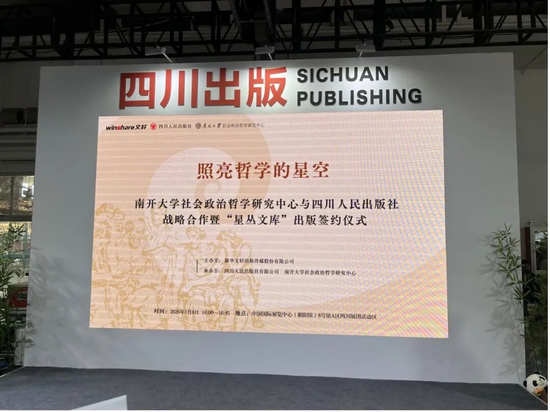 2026年1月8日于北京图书订货会四川展区,南开大学社会政治哲学研究中心与四川人民出版社隆重举行了战略合作暨“星丛文库”出版签约仪式。此次活动由新华文轩出版传媒股份有限公司主办,四川人民出版社与南开大学社会政治哲学研究中心联合承办,正式宣告双方就大型哲学学术丛书“星丛文库”达成战略合作。仪式汇聚了学术界、出版界及翻译界的众多代表,共同见证了这一旨在深化哲学研究、推动中西思想对话的重要学术工程启航。