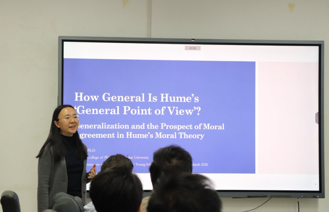 南开大学的祁箫老师在题为“How General Is Hume’s ‘General Point of View’?”的报告中探讨了休谟的“一般观点”理论能否真正保证跨文化、跨情境的道德一致性。祁老师首先指出,在休谟的道德理论中,道德判断建立在道德情感之上,而道德情感在大多数情况下通过共情产生。然而,共情的强度受到时空距离、亲疏关系等因素的影响,这与道德判断的稳定性相矛盾。为解决这一矛盾,休谟引入“一般观点”理论,即认为评价者将自己固定于某一稳定、一般的立场上进行道德评价。