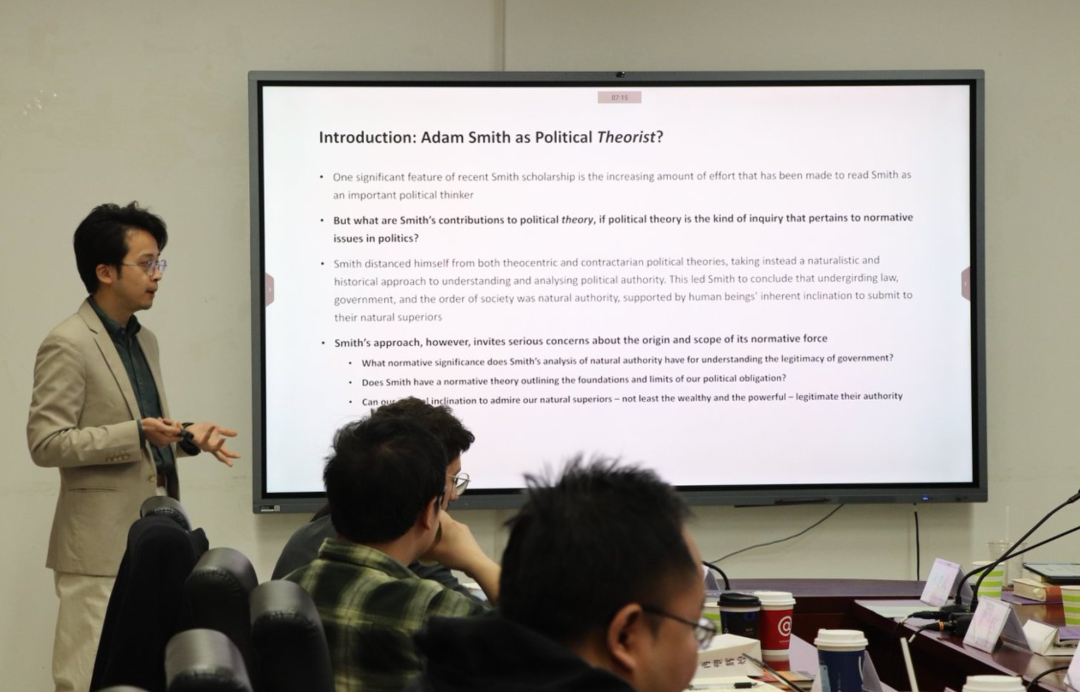 清华大学孙宇辰老师的报告题为“The Problem of Normativity in Adam Smith’s History and Theory of Natural Authority”。他探讨亚当·斯密政治理论中的规范性问题,即其对自然权威的分析能否为政治义务提供规范基础。孙老师首先梳理了四种对斯密政治理论中规范性问题的主要解读并指出其局限:邓肯·福布斯(Duncan Forbes)的“怀疑辉格主义”低估了斯密政治理论处理规范性问题的能力;唐纳德·温奇(Donald Winch)与约翰·邓恩(John Dunn)将斯密视为关于权威的社会学家,也低估了其规范性承诺;伊斯塔凡·洪特(Istvan Hont)虽指出斯密的商业史具有规范含义,却未能明确其来源;保罗·塞格尔(Paul Sagar)虽强调意见的规范作用,却预设了斯密在这一点上认同休谟,而忽视了斯密自身对该问题的阐述。