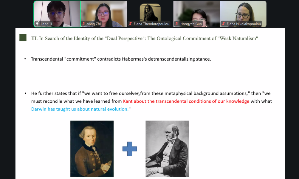 发言结束后埃莱娜・西奥多罗普卢(Elena Theodoropoulou)对三位同学的汇报都加以认同,指出同学们的主题与具体分析都很有趣,这些讨论在希腊爱琴海大学实践哲学研究实验室与中国的文化与思想之间打开了沟通的渠道。
