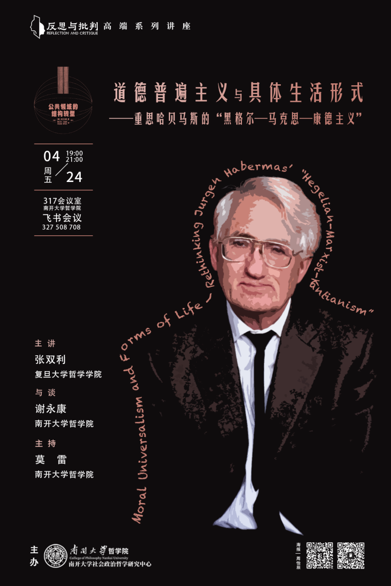 讲座信息讲座主题:道德普遍主义与具体生活形式——重思哈贝马斯的“黑格尔—马克思—康德主义”讲座系列:“反思与批判”高端系列讲座讲座时间:2026年4月24日(周五)晚上19:00讲座地点:南开大学哲学院317会议室飞书会议号:327 508 708讲座简介:综观哈贝马斯社会和政治哲学思想的发展,其核心问题意识在于如何用一种富有黑格尔和马克思色彩的康德式道德普遍主义立场来正面回答在资本主义的条件之下重建现代民主政治何以可能。在其早期著作《公共领域的结构转型》中,透过对康德法哲学的解析,哈贝马斯已经指出,以理性自由为原则的现代民主政治,不仅要以公共理性为根据,而且要以政治经济学所预期设的那种理想化的市民社会为社会前提。而现代民主政治的难题恰恰在于,在资本主义的条件之下,这两方面的基础都不存在。从黑格尔和马克思的市民社会批判到一代批判理论家的资本主义体系批判,已深刻揭示出其社会前提的缺失;从韦伯的理性化理论到霍克海默和阿多诺的工具理性批判,则进一步指出了其理性根据并不存在。在此背景之下,为回应现代民主政治在晚期资本主义条件下所陷入的合法性危机,哈贝马斯致力于在理论上说明这双重前提如何能够被重